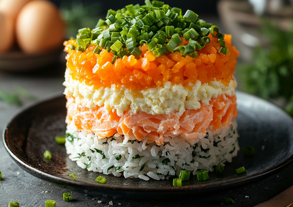 2. Архитектура вкуса: чередуйте слои как художник — рисовая подушка, россыпь розового лосося, яркие морковные акценты. Завершите композицию золотистым покрывалом из тертых желтков!
